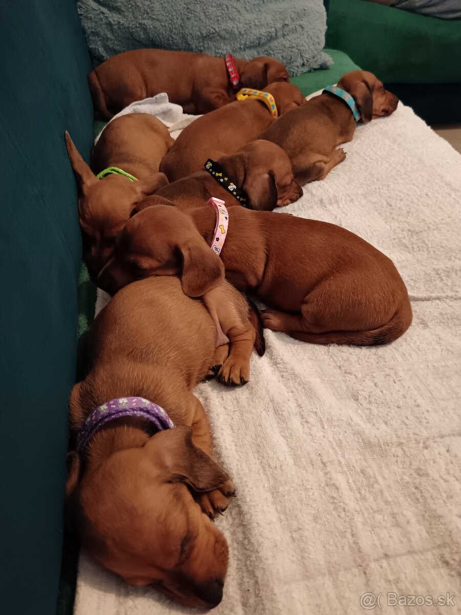 Naše nádherné šteniatka "krátkosrstý jazvecik štandard" s úžasnou povahou po mame a po otcovi si budú hľadať svoje milujúce rodinky🥰.Narodili sa 20.11. do svojich nových domovov môžu ísť od Silvestra.. 6 suciek a 3 psy..farbou su všetci krpci odtiene po mame "červena" s prímesou tmavšej, otec je merle trikolor, obidvaja k videniu u nás doma. Šteniatka budú 3x odčervené a 1x očkované, socializované, naučené na deti a psikov! Vhodné do bytu aj na dvor.