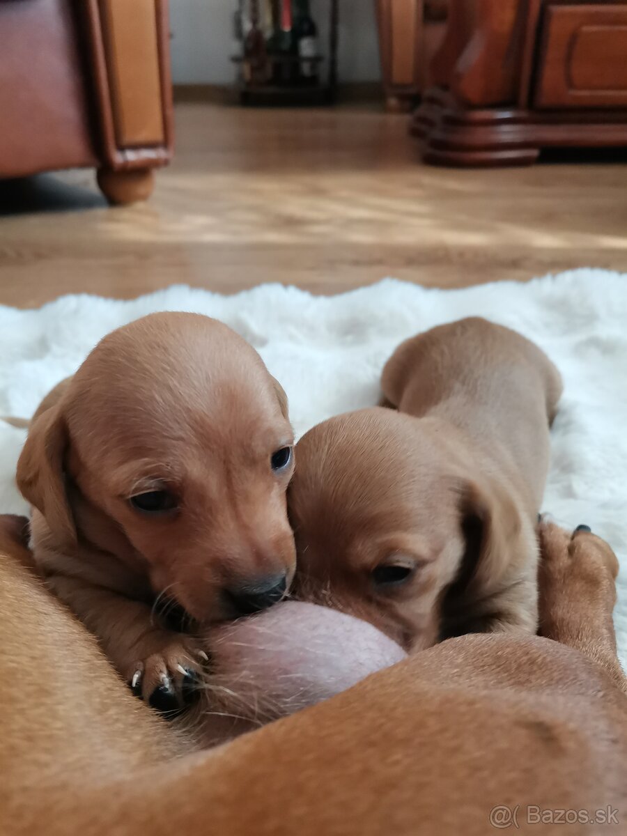 Rezervujeme čistokrvné šteniatka jazvečíkov narodených 07.novembra 2025. Rodičia hladkosrstí, štandard bez papierov. Obaja potomkovia po poľovníckych predkoch. Výborná genetická výbava po fyzickej stránke a čo sami obzvlášť ceníme sú povahové vlastnosti. Šteniatka budú k odberu okolo vianoc po dovŕšení 7 týždňa. Od druhého týždňa sú pravidelne odčervované. Momentálne majú 21 dní. Sú tri fenky ostatné sú psíky.Postupne socializované na okolie. Vážime si serióznych a budúcich starostlivých majiteľov ktorí poskytnú týmto roztomilým stvoreniam lásku a podelia sa s nimi o svoj domov. Sú to nerozluční, obzvlášť vnímaví a oddaní spoločníci.Kopírujú vlastnosti a správanie svojho pána.