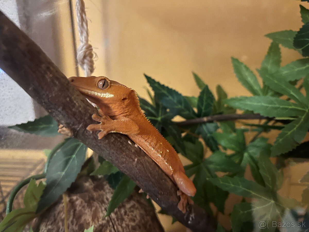 Pagekon ma cca 2 roky, v terariu je substrat, umela rastlina, kokosovy domcek.