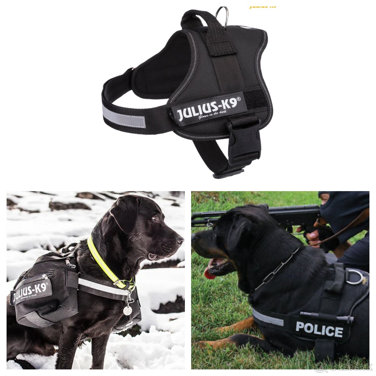 -taktický postroj Julius K9 s reflexným pruhom, okom na vôdzku, rukoväťou na držanie psa a bočnými plochami na pripnutie rôznych nápisov na suchý zips, respektíve na zavesenie sidepackov