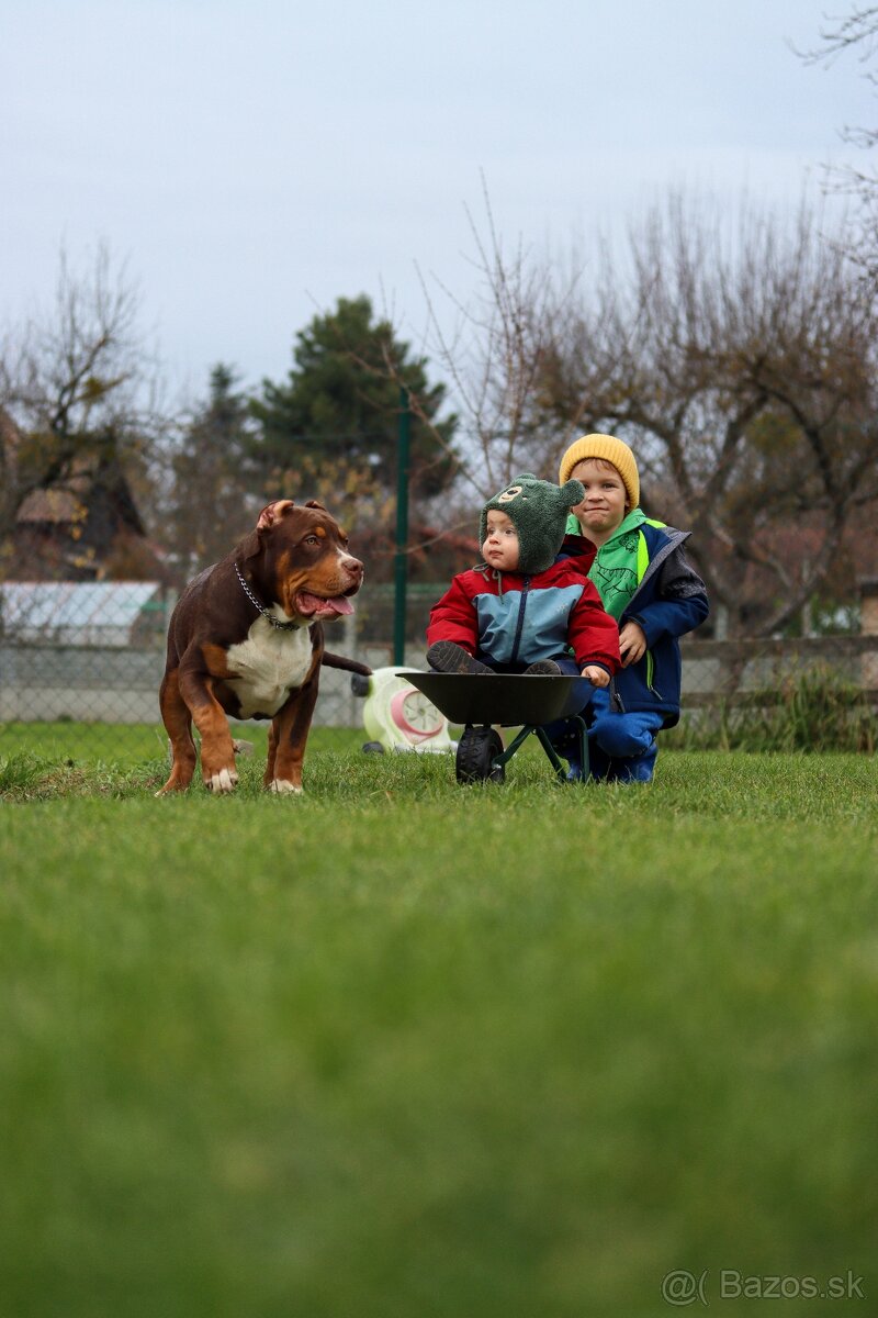 Ponúkame posledné voľné šteniatko American Bully XL (psík) v nádhernom sfarbení chocko Tricolor. Šteniatko sa narodilo 27. 6. a pochádza zo