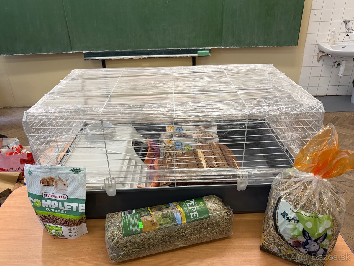 Set obsahuje priestrannú klietku, drevený tunel, domček, misku, seno, granulky a ďalšie doplnky.