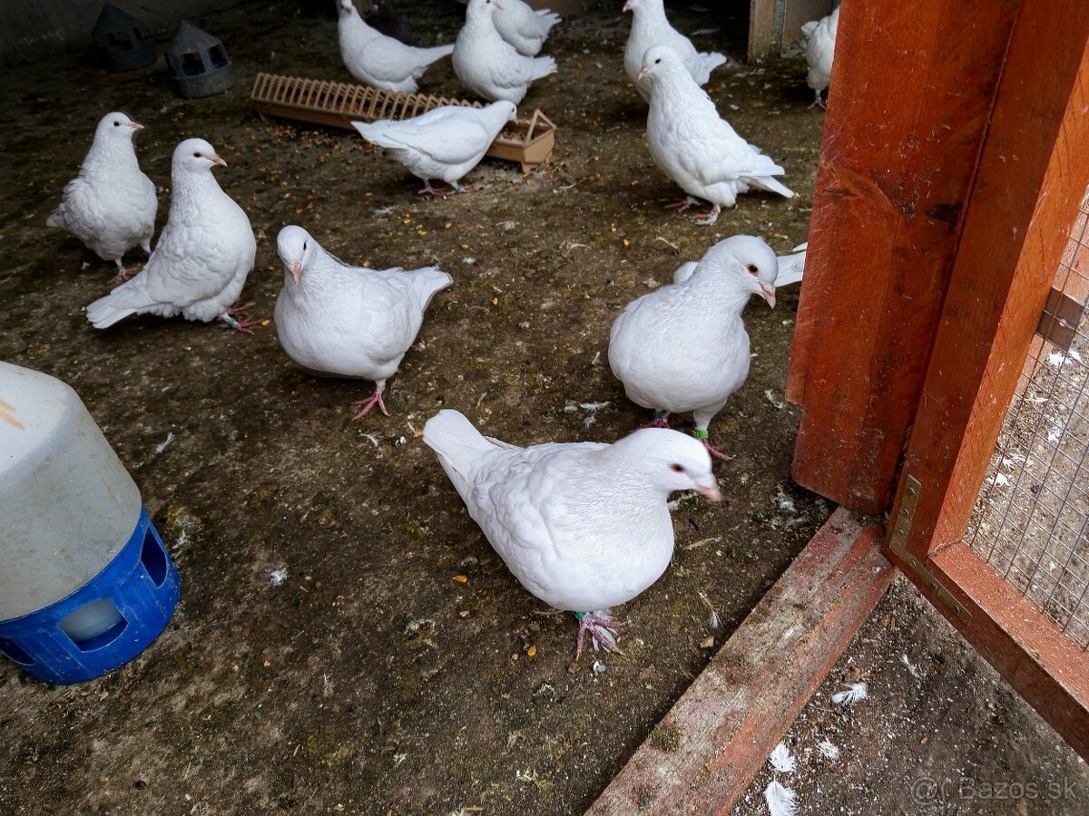 BIELE POŠTOVÉ HOLUBY - [24.12. 2025]Predám tohtoročné biele holuby aj iné farby na foto. Niektoré majú aj chocholku na hlave. Cena 5€ kus.