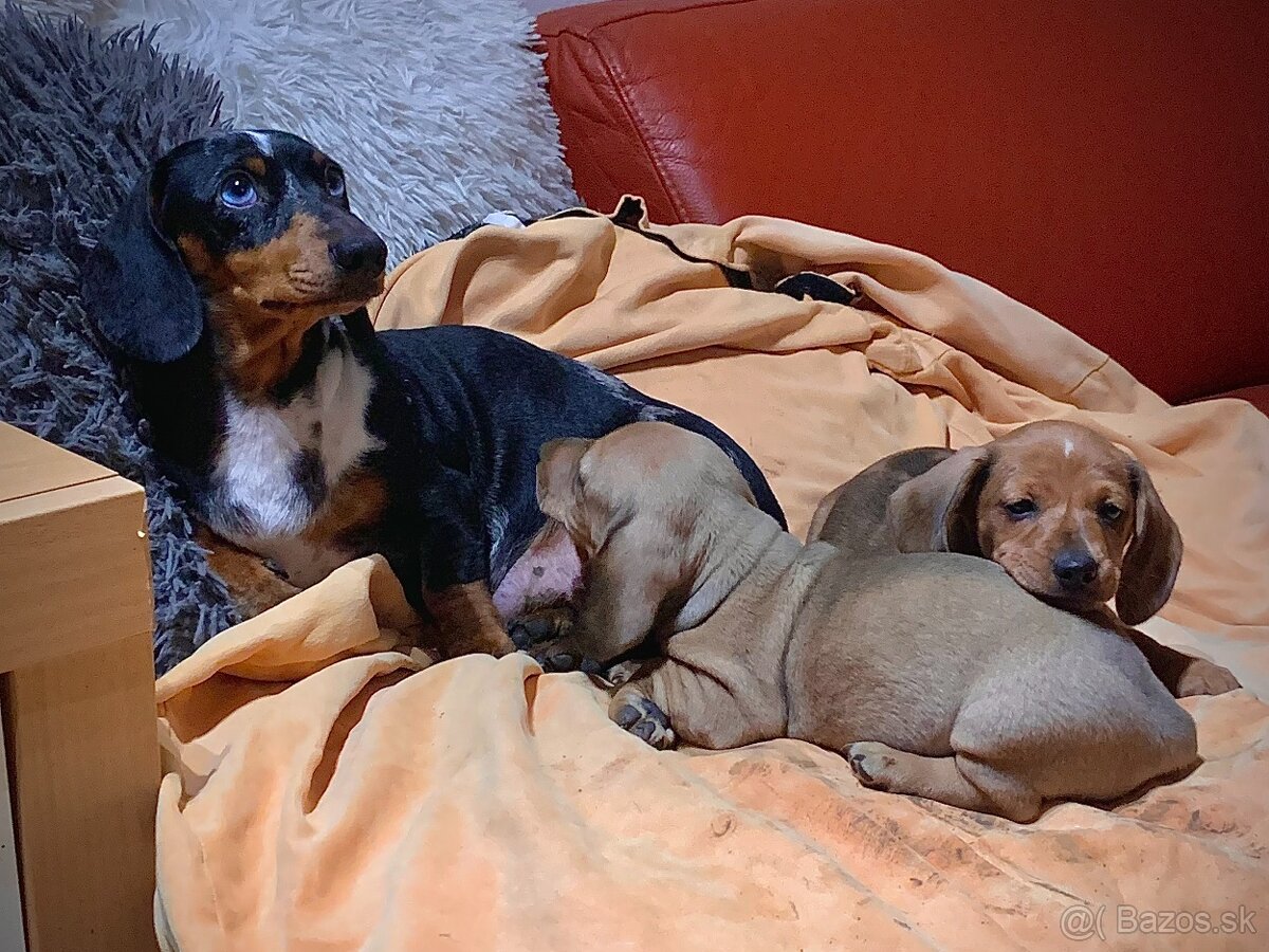 Predám 7-týždňové šteniatka jazvečíka trpsaličieho krátkosrstého, hnedá merle sučka, psík bledý sivý. Psík sa narodil s trochu kratším chvostíkom, viď. foto. Šteniatka sú odčervené, zdravé, hravé a pripravené k odberu.