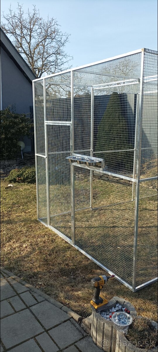 Predám volieru hliník plast 2x2x1 pletivo 19x19x1,4 otočný pult 3misky.
