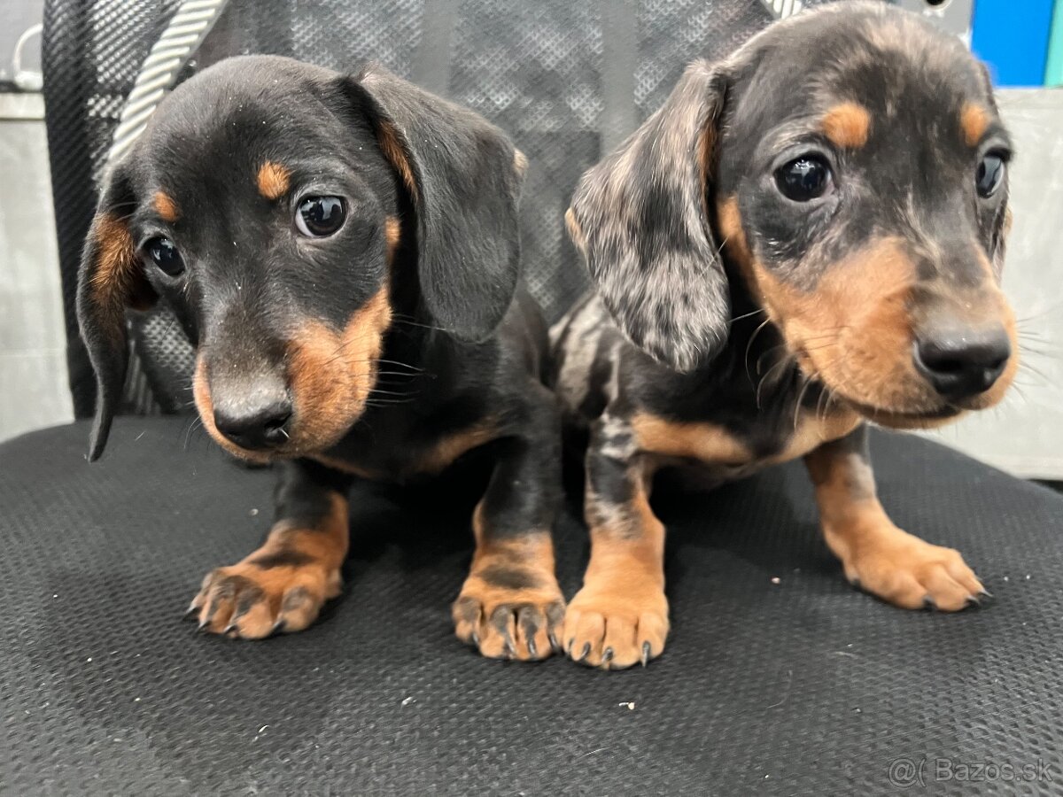 Jezevčík trpasličí merle - TOP - [23.12. 2025]Predám 7-týždňové šteniatka jazvečíka trpsaličieho krátkosrstého, hnedá merle sučka, psík bledý sivý. Psík sa narodil s trochu kratším chvostíkom, viď. foto. Šteniatka sú odčervené, zdravé, hravé a pripravené k odberu.