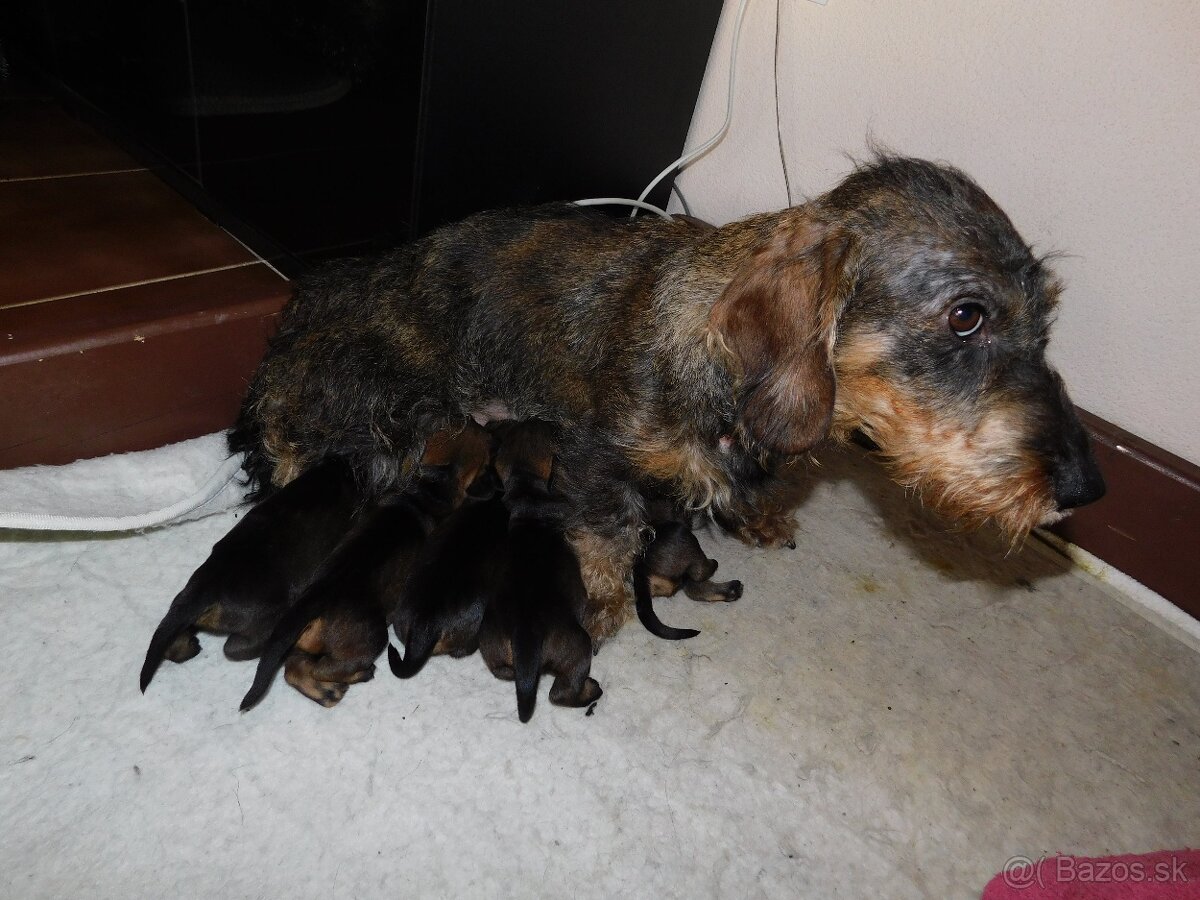 Predám šteniatka jazvečíka hrubosrstého štandart bez PP. Rodičia poľovne upotrebený s PP. Šteniatka 3 fenky a 3 psíky narodené 16.12.2025.