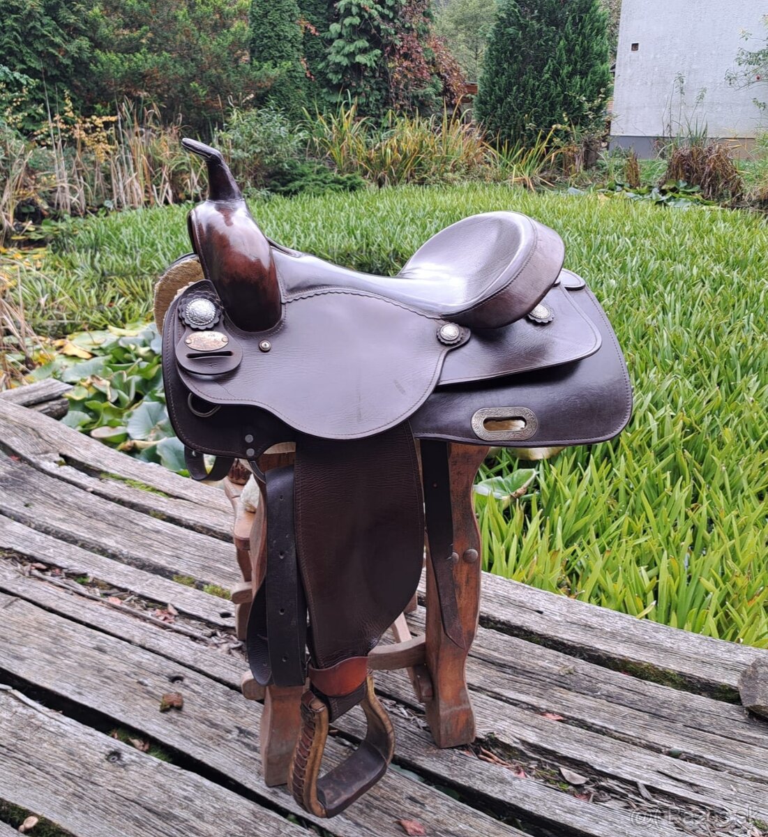 Ponúkam na predaj krásne westernové sedlo z pravej, kvalitnej kože v tmavohnedej farbe.
