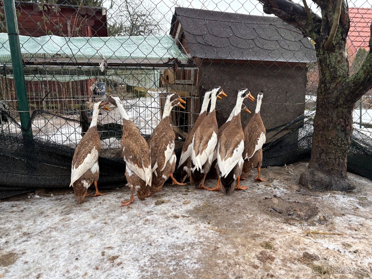 Predám indické bežce - srnčí sedlatý, minuloročné, vysedené kačkou. V ponuke je 2x káčer a 5x kačka, pred znáškou. Výborné na likvidáciu slimákov. Zdravé, nenáročné na chov.