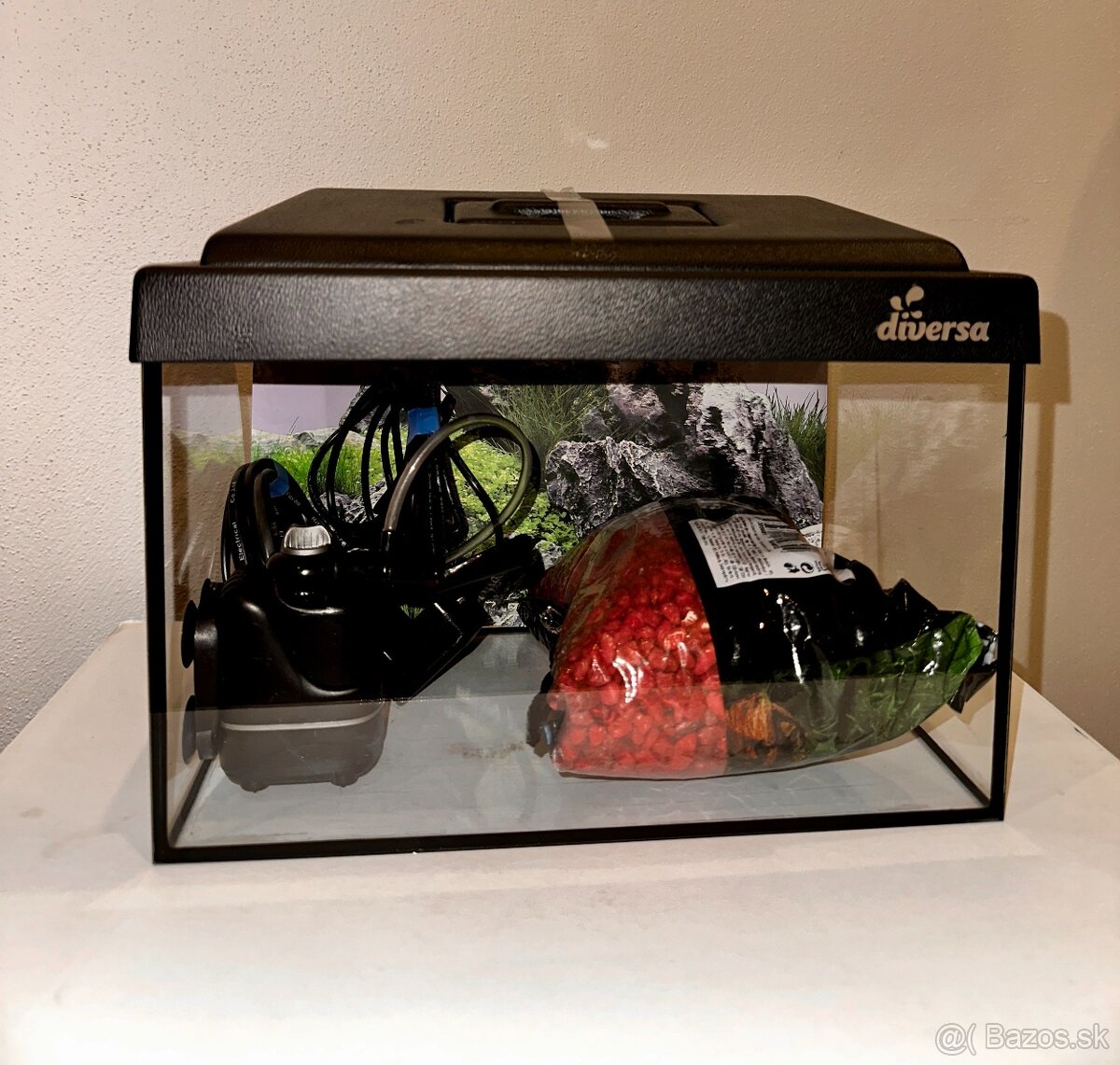 PREDÁM akvárium (viď. foto) 12L o rozmeroch 30x20x20cm s originálnym plastovým krytom so vstavaným osvetlením a otvorom pre kŕmenie, prietokový filter s okysličovaním, obojstranné dekoračné pozadie (fólia), štrk prípadne drobné dekoračné doplnky.