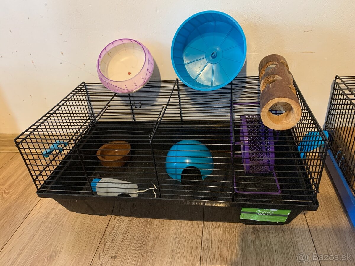 Predám dve klietky pre škrečkov spolu so všetkou výbavou- napájačky, krmidlá, kolotoče na behanie, domčeky… pridám aj čisté hobliny.