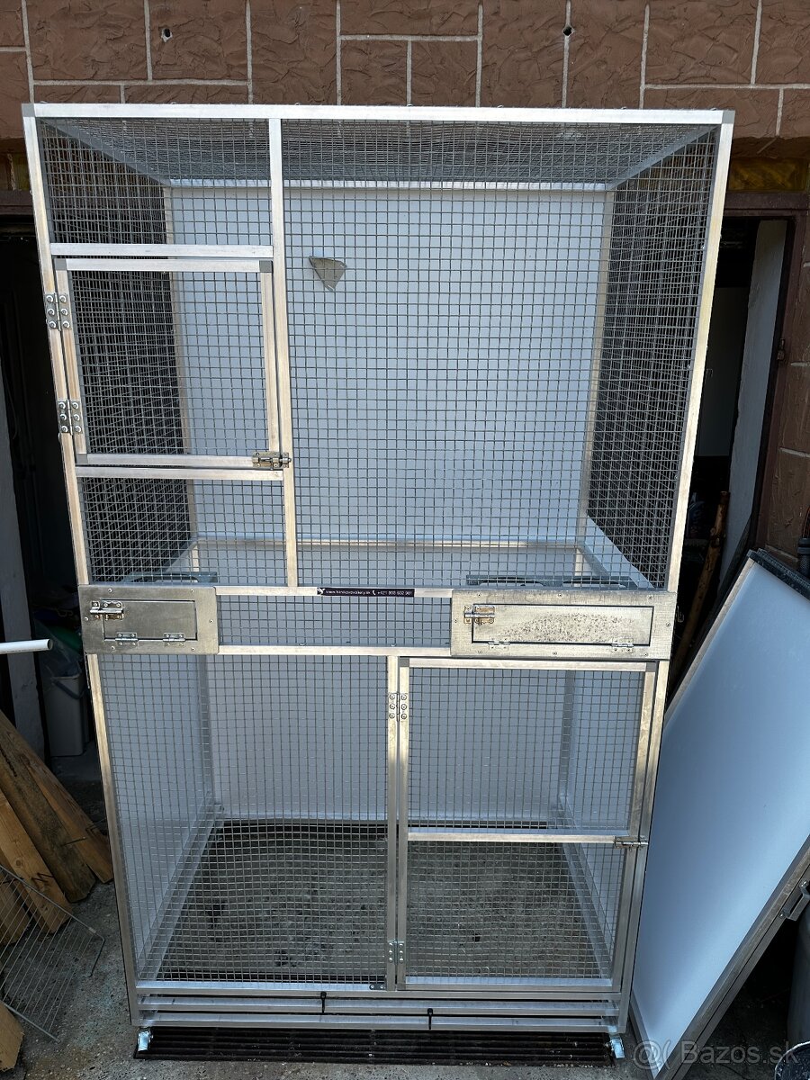 Predám voliéru/klietku pre papagáje. Disponuje jednym dvojmiestnym výsuvným krmnym pultom na misky a jedným jednomiestnym (misky sú súčasťou). Na spodku voliéry sú dve vysuvne platne na zachytávanie odpadu a lepšiemu čisteniu (jedna platna je z pletiva a druha plná). Voliéra je na otočných kolieskach. Rozmery dĺžka120xsirka80xvyska200cm (výška s kolieskami 207cm)