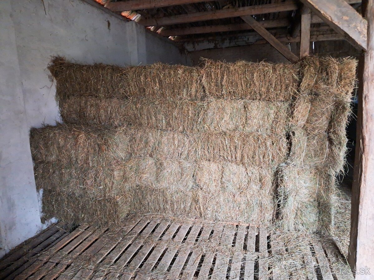 Seno - malé balíky - [9.2. 2026]Ponúkam na predaj malé balíky sena o rozmere cca 60x40x30cm o váhe 12-14kg. Seno je z júnovej kosby, ani raz nezmoklo. Momentálne je uskladnené v stodole. Cena za kus je 3€. Dostupných je 50ks balíkov.