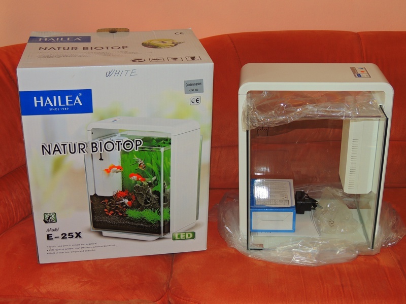 Predám nový nepoužitý akváriový set / akvárium Hailea E 25X s objemom 25 l v bielom prevedení. Akvárium je sklenené a má integrované LED osvetlenie s dotykovým ovládaním vo vrchnej časti. LED osvetlenie môže osvetľovať akvárium bielym (denným) svetlom alebo modrým (nočným) svetlom, alebo kombináciou oboch.