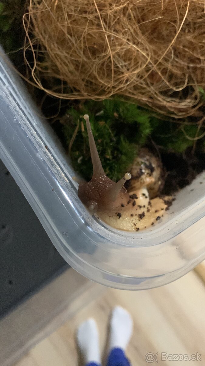 Slimak africký - [25.2. 2026]Predam malinke africke slimaky, majú asi mesiac. Mame asi 30 malych slimákov. Kus za 0,5 eur. Na obrázku sú aj rodicia.