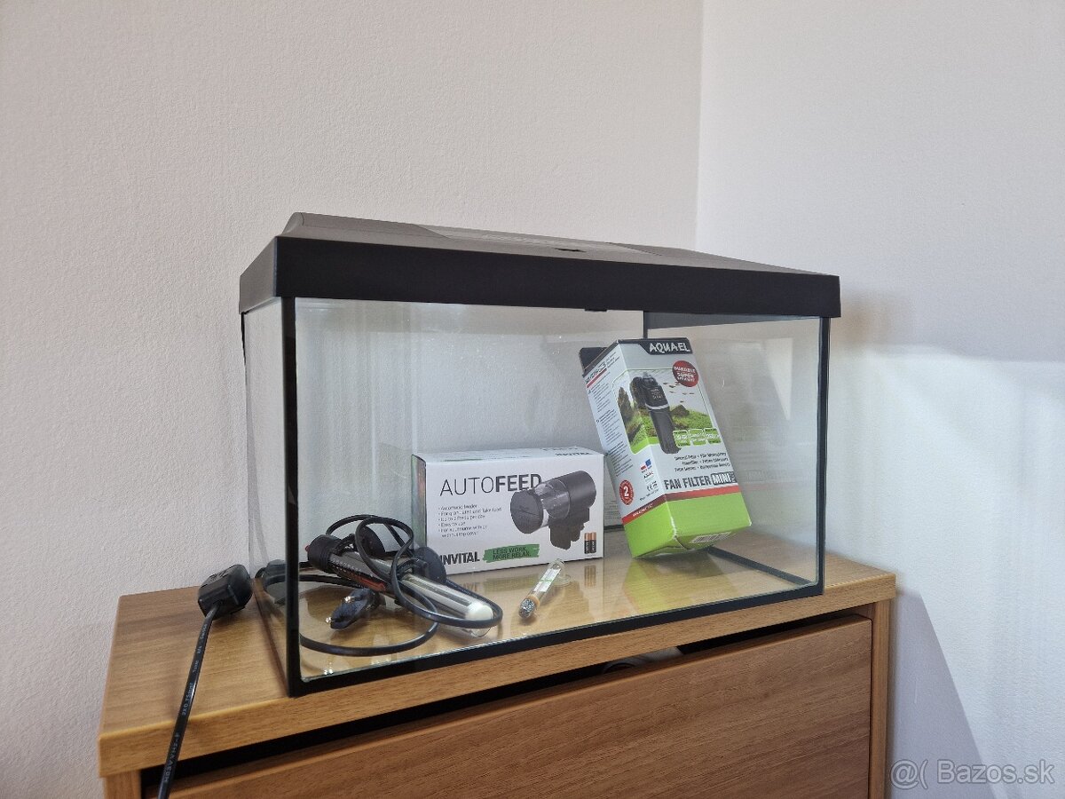 Dobrý deň. Predám akvárium aquael 25l s prislušenstvom. Filter aquael Fan mini plus, ohrievač 50w, teplomer, svetlo s krytom, automatické kŕmidko, čierno modré pozadie a staré dno.