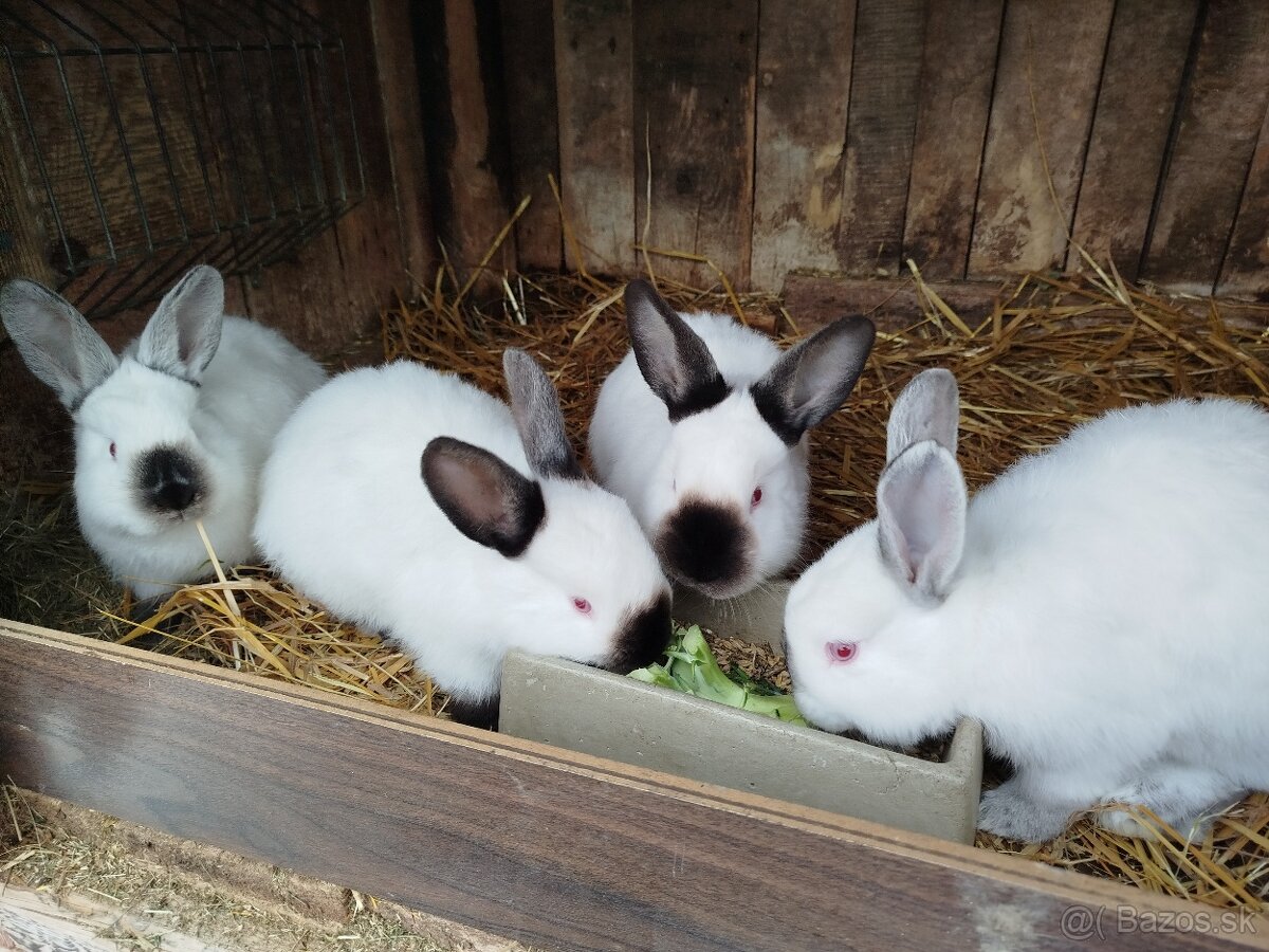 Kalifornský králik - [3.2. 2026]Kalifornské králiky - mám na predaj krásne vyfarbené mladé samce a samice narodené v auguste 2025, vek 5.5 mesiaca. Zaočkované proti moru a myxomatóze. Preliečené sulfacoxom. Kŕmené suchým krmivom - jačmeň, ovos, slnečnica, hrach, seno. Je to nenáročné plemeno vhodné
