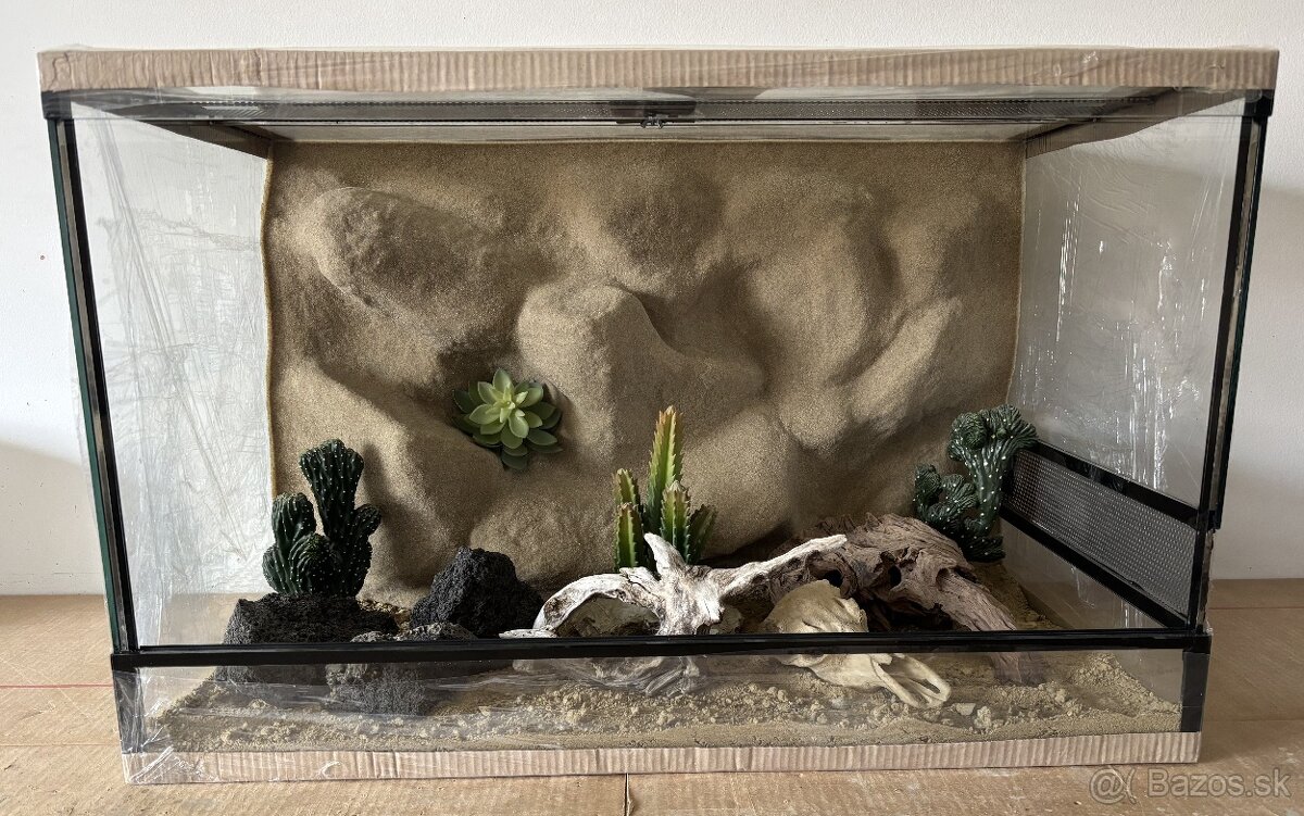 Predám nové teráriu s rozmermi DxŠxV 80x50x50. Je vyhotovené z 5mm skla, má dvojité vetranie a vpredu posuvné dvierka. Súčasťou terária je členitá 3D stena s väčšími teraskami. V prípade záujmu viem ponúknuť aj teraríjne príslušenstvo. Na výber je z 2 kusov. Cena za terárium je 190 eur. Dovoz možný takmer po celom Slovensku.