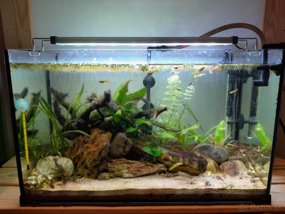 Darujem akvárium 50x25x30 cm spolu s ohrievačom, substrátom, kameňmi, koreňom a rastlinami. Možnosť vziať aj s rybami - gupky mix. Bez filtra a osvetlenia.