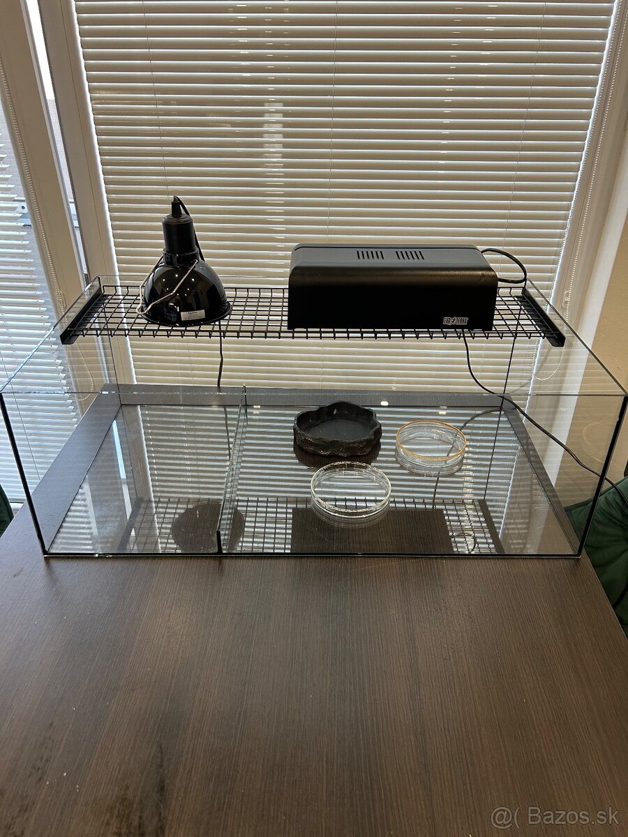 Predám terarium s rozmermi 70x38x24 cm plus príslušenstvom UV lampou EXO Terra, termo lampou a roštou pod lampy. Plus mysky pre korytnačky.