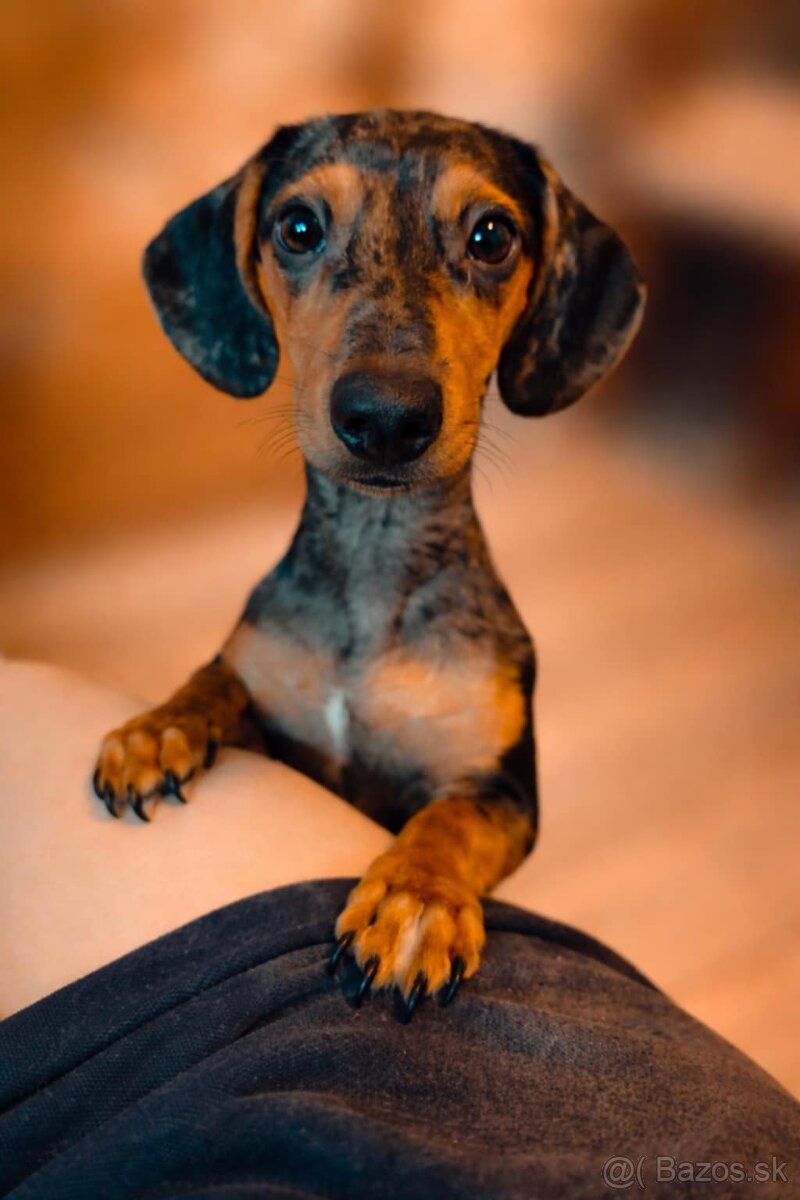 Hľadám domov pre 6-mesačne šteniatko kríženeho jazvečíka v merle farbe.