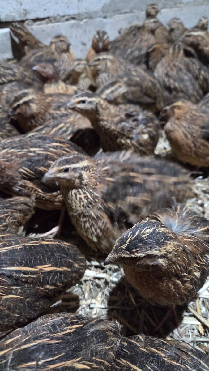 Japonské prepelice (Faraón Jumbo) mäsovonosivý typ - [7.2. 2026]Mladé 7-týždňové japonské prepelice (mäsovonosivý typ) sliepočky 5€/ks pred znáškou. Kohúty 2,50/ks.