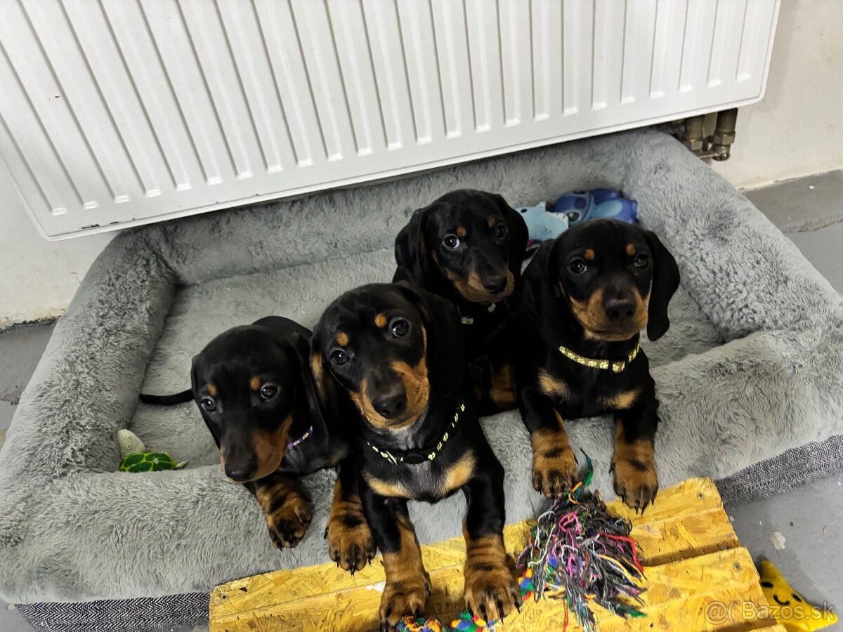 Šteniatka 6 týždňov jazvecik - [6.2. 2026]V ponuke 3 chlapci jazvečík, midi, krátkosrsty,nar. 23.12.2025, odcervenie, ocko, knižkovanie. Najskôr odber 23.2.2026, sfarbenie 1x karamel, 2 krát čierny s hnedým vykreslenim. Sú bez PP. Len do dobrých rúk a milujucej rodiny, lebo sú to miláčikovia. Silvia 0944473211
