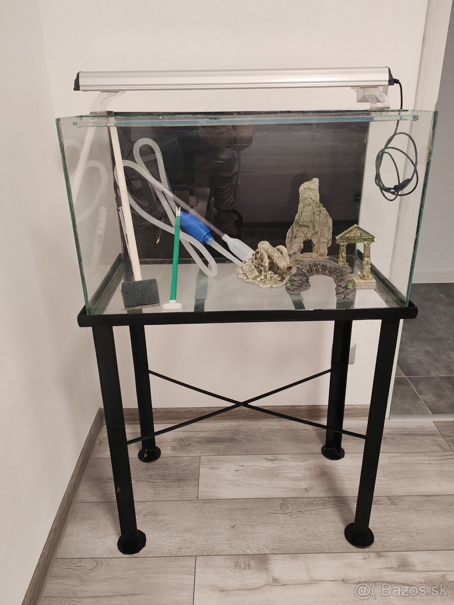 Predám akvárium 112 l s rozmermi dĺžka-70 cm, šírka-40 cm, výška-40 cm na kovovom podstavci s výškou 70 cm, používané cca 5 rokov, zachovalé v dobrom stave plus k akváriu aj príslušenstvo, ktoré je na fotkách - svietidlo, ohrievač vody s termostatom, dekorácie, veci na čistenie a starší ale funkčný kompresor.