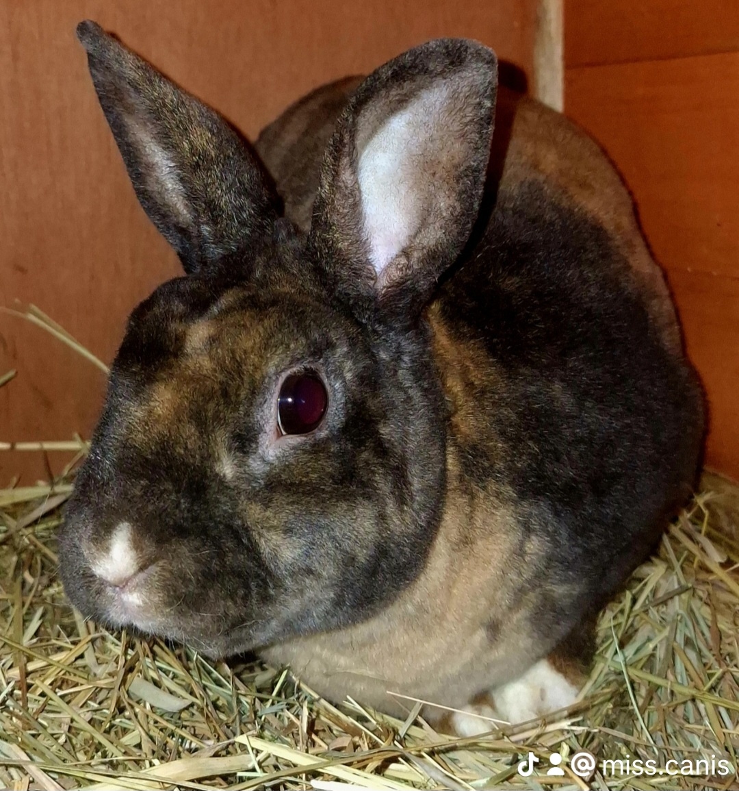 Ponúkam na predaj skoro ročného zakrslého králika Mini Rex Satén samčeka vo farbe Harlequin. 🐰
