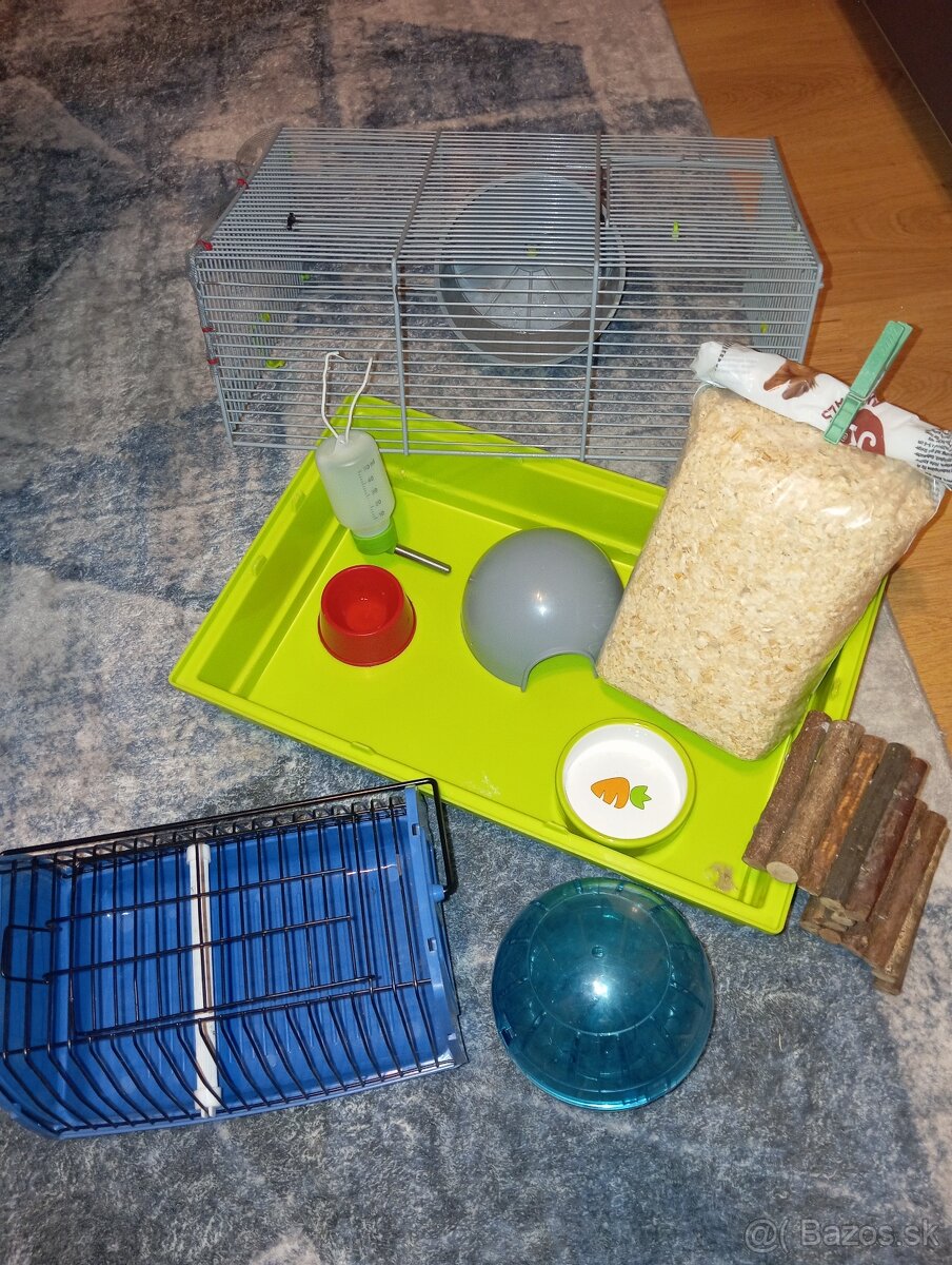 Set obsahuje : klietku s kolotočom, prenosnu klietku, domček, napájadlo na vodu, misku na vodu, drevenú preliezku a guľu na výbeh 😃 pridám ešte 3/4 sacka hoblin