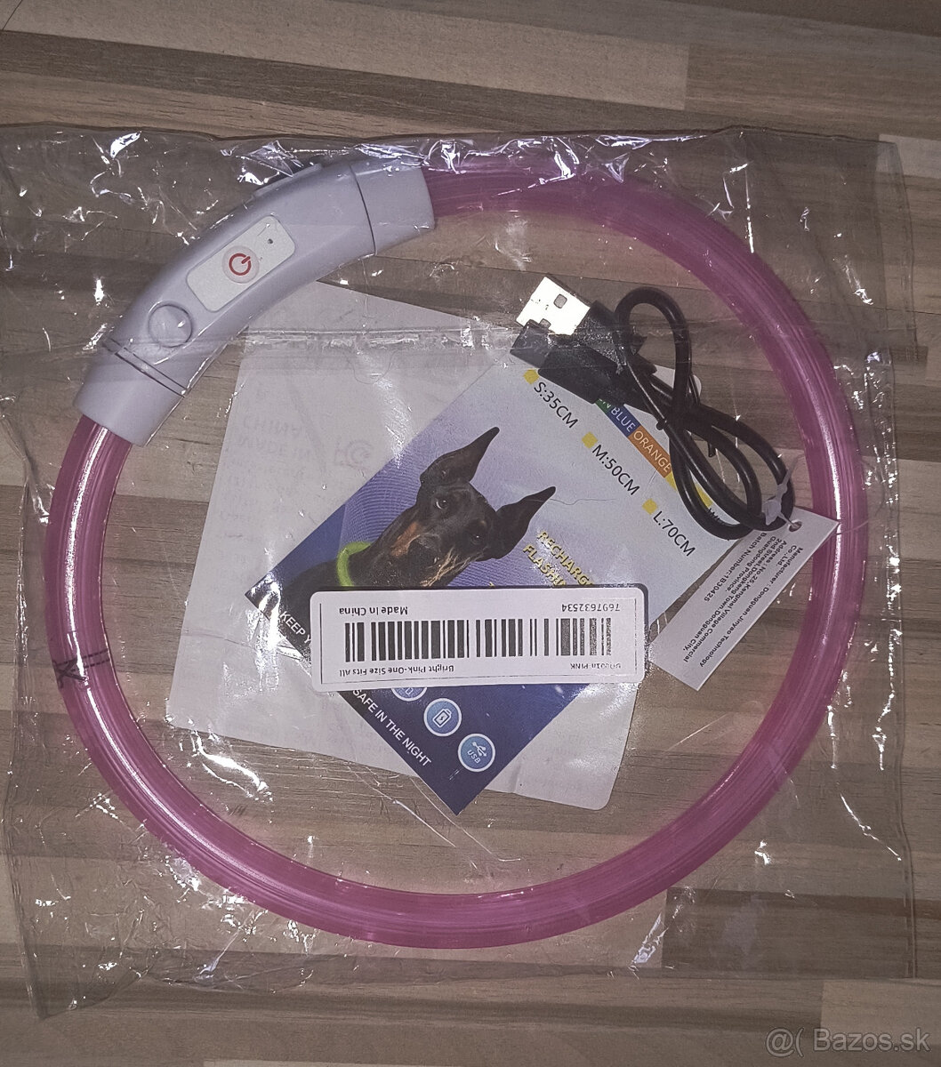 Predám nový svieťiaci obojok, nabíjanie cez USB, vnútorný priemer cca 15 cm, keď som ho rozpojila tak dĺžka je cca 53 cm, je vhodný pre stredné plemená. cena 5 eur