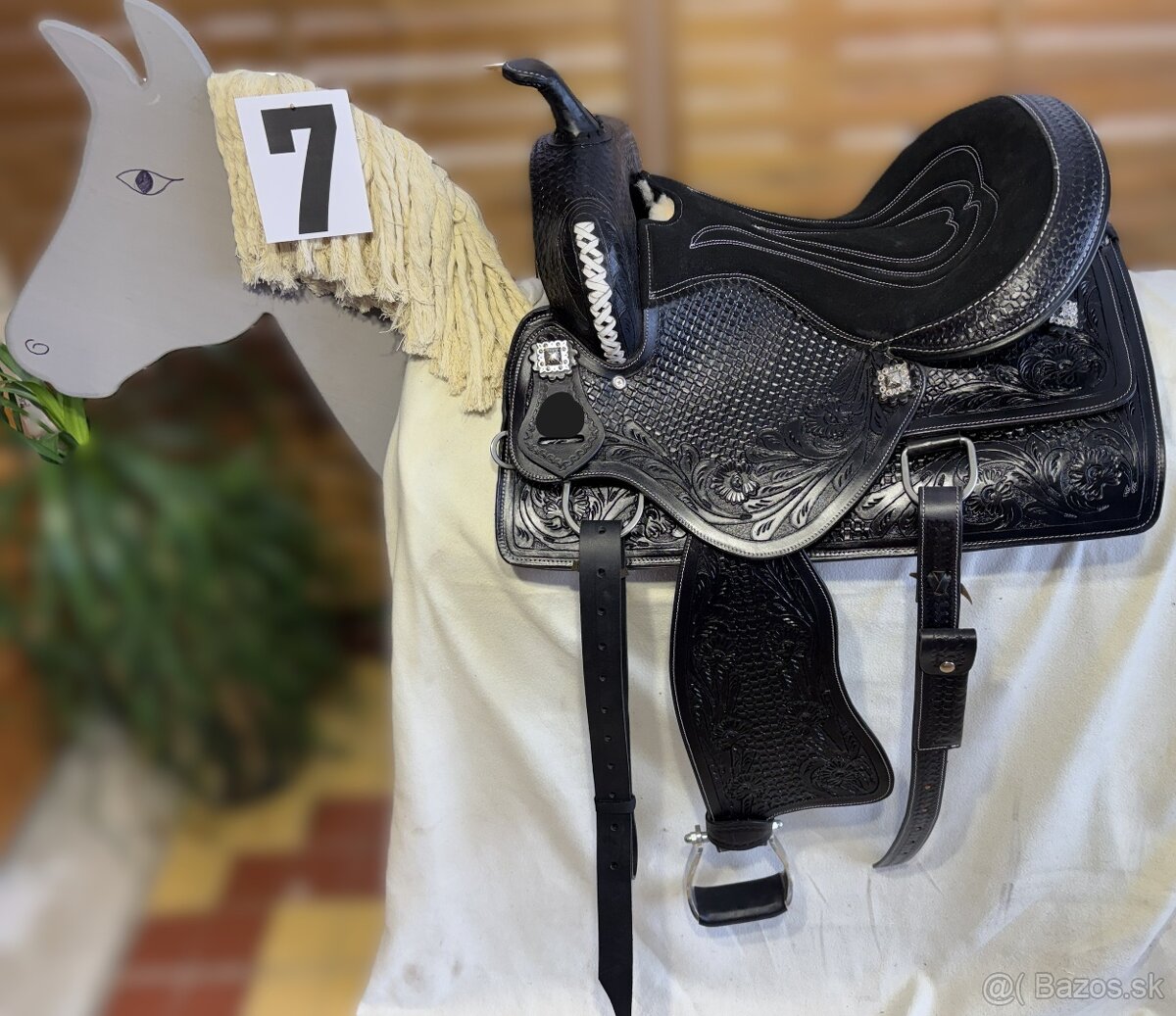 Westernový sedlový komplet 5) černý - [26.2. 2026]Westernové sedlo-komplet č.5) v černé barvě. Velikost sedla je Full/QH, 16" (40,5cm) i 17" (43cm) v sedu, gulett/komorou 8" (20cm). Celková délka sedla je 65cm. Sedlo je v částečné dekoraci Floral s úzkou bordurou. Černý měkký kožený sed bez prošívání. Zadní středové "Déčko" k použití podocasníku ne ...