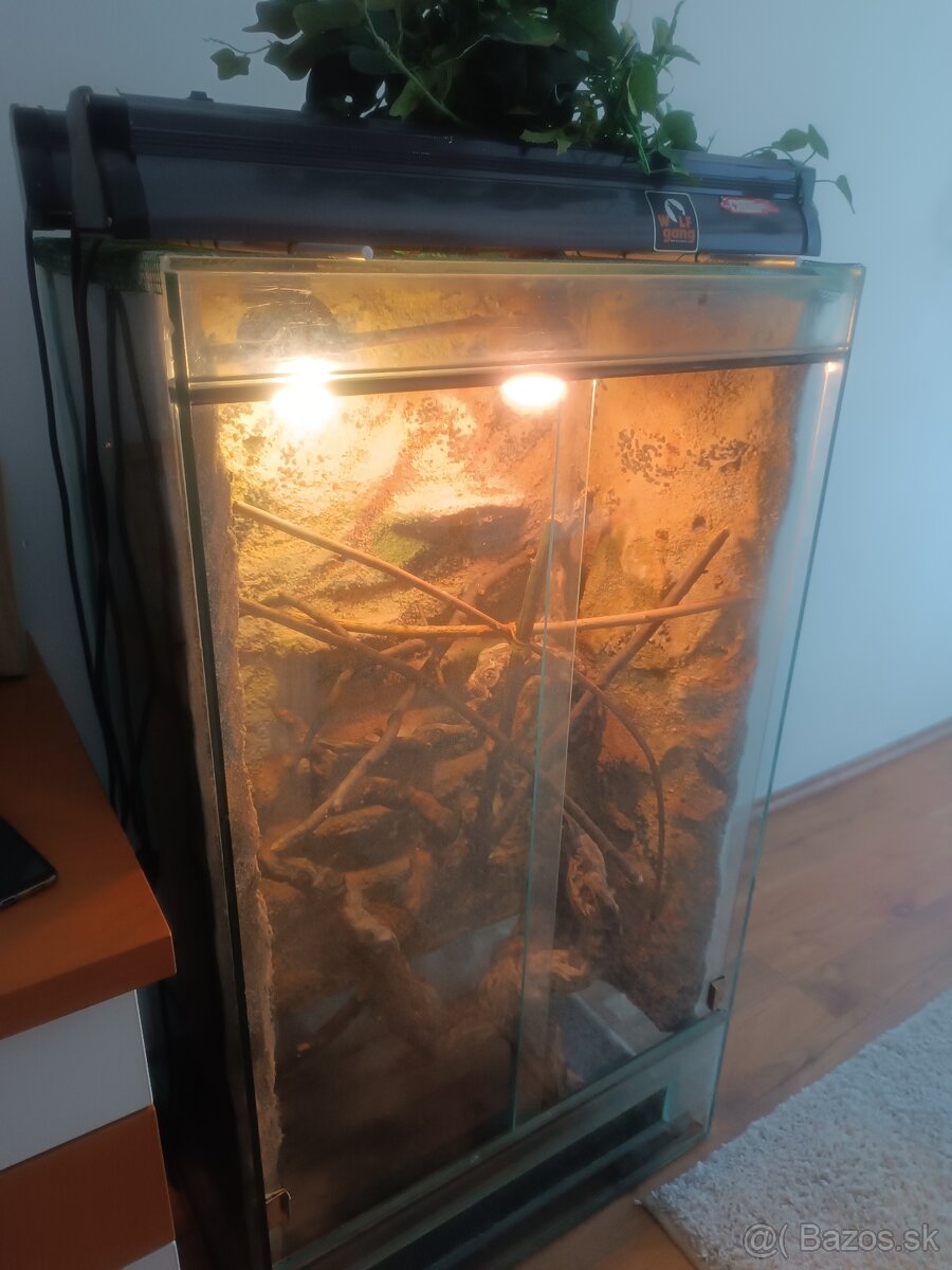Predám zariadené terarium pre chameleóna s pozadím, osvetlením, koreňmi a rastlinami.