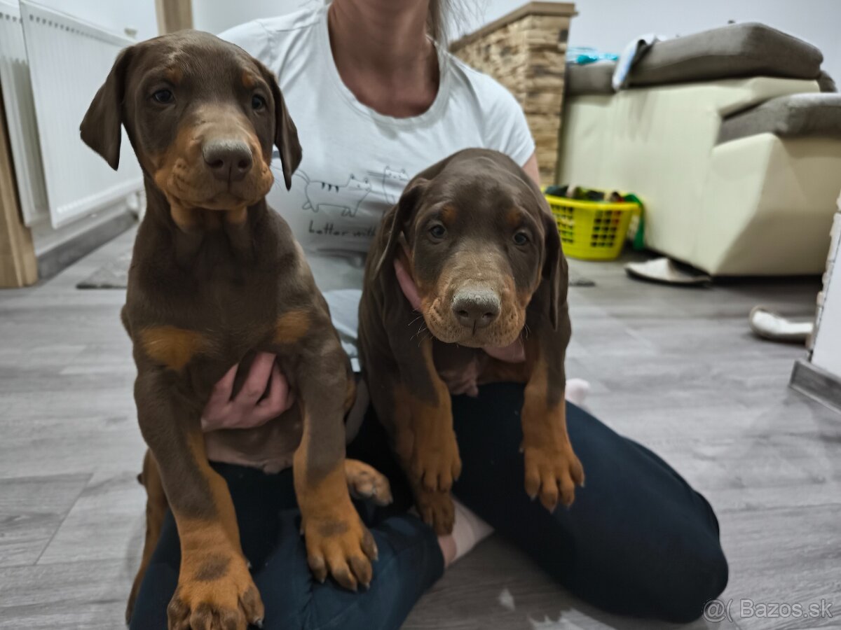 Predám krásne hnedé šteniatka dobermana bez PP. Šteniatka budú v čase odberu 2 x odčervené, očkované, chipovane s očkovacím preukazom. Šteniatka sú hravé, majú rôzne povahy. Sú kŕmené kvalitnými granulami a mletým hovädzím mäsom. Rodičia sú mohutnej postavy. Otec s PP matka bez PP. Odber možný 20.3.2026. V ponuke 2 krát psík.