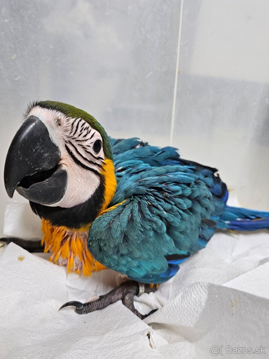 Predám mladého samčeka Ara Ararauna, ručný odchov, pevný krúžok, testy DNA , testy na PBFD , Ch.psittaci , APV