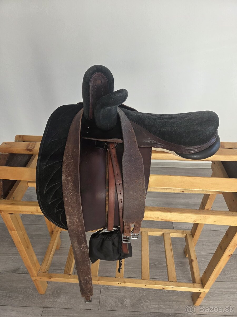 Na predaj dámske sedlo z dielne českej sedlárky Jany Vedralovej. Sedlo u mňa minimálne používané, vo výbornom stave. Kombinácia kože a brúsenej kože. Som druhý majiteľ. Predávam vrátane strmeňového remeňu a dámskeho bezpečnostného strmeňa. Špecifické je v tom,že má 2 možnosti namontovania skokovej hlavy.