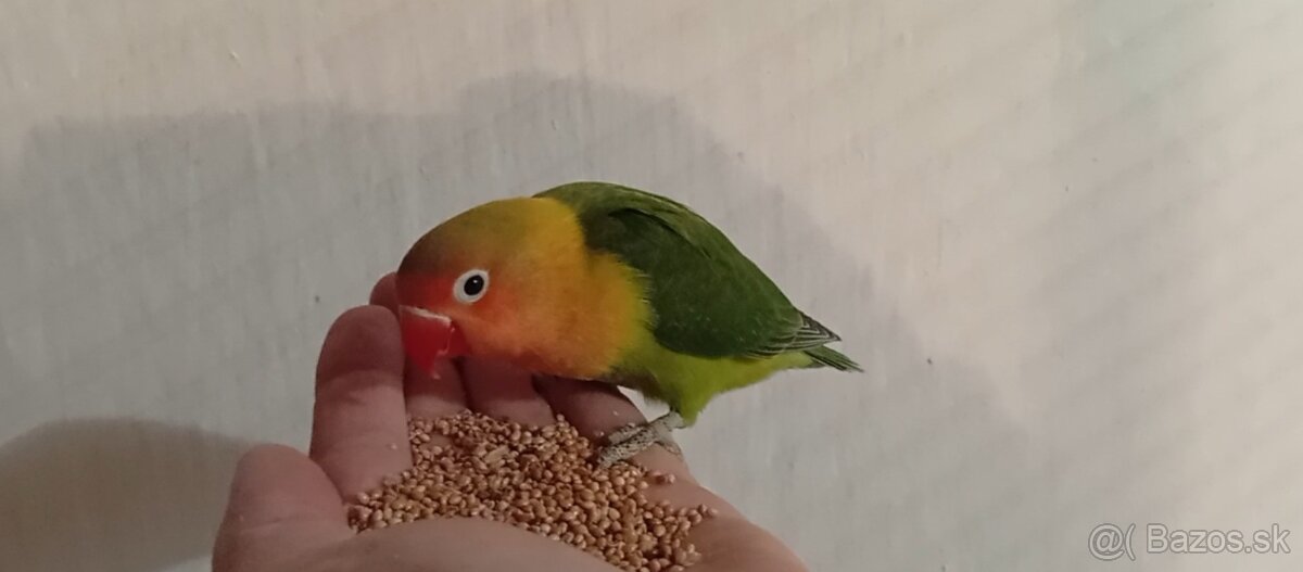 Agapornis zlty - samicka - [25.2. 2026]predam 1 ks agapornisy-vtaciky lasky, krasne spievaju, maju 1,5 roka, samicka ma certifikat, kupovane v superzoo, dovod predaja- prerabka bytu