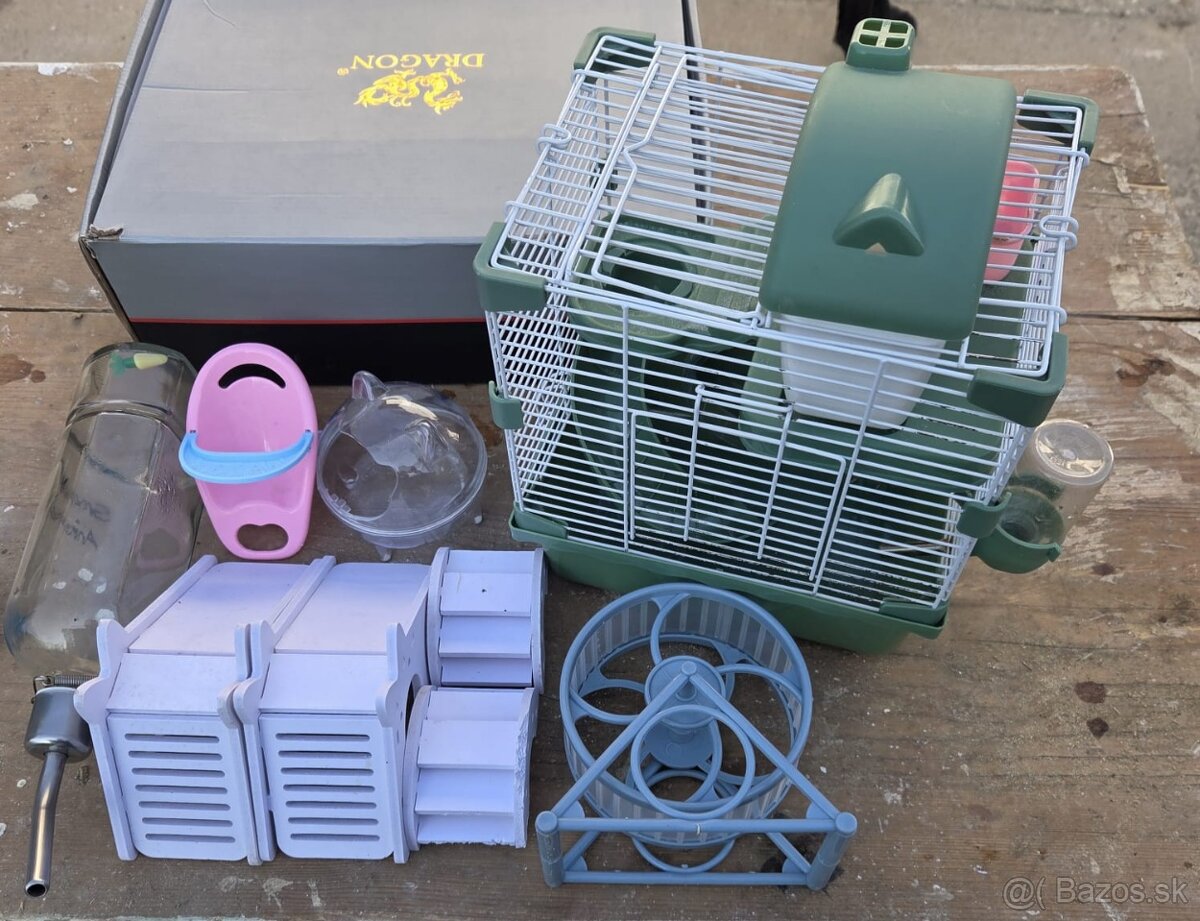 Poschodová klietka, koliesko, domček/wc, šmýkaľka, krmítko, napájatko) + extra drevené preliezačky a domčeky, jedálenská stolička)