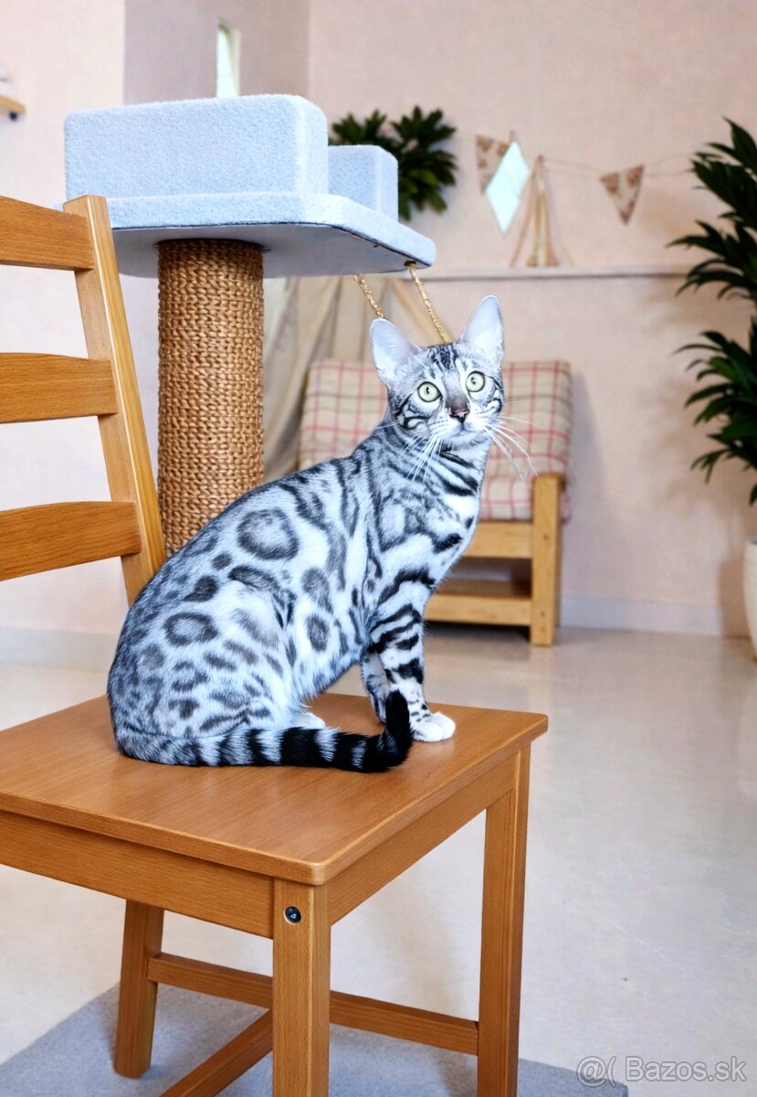 Na predaj je 9-mesačná, s rodokmeňom registrovaná strieborná bengálska mačka (samička).